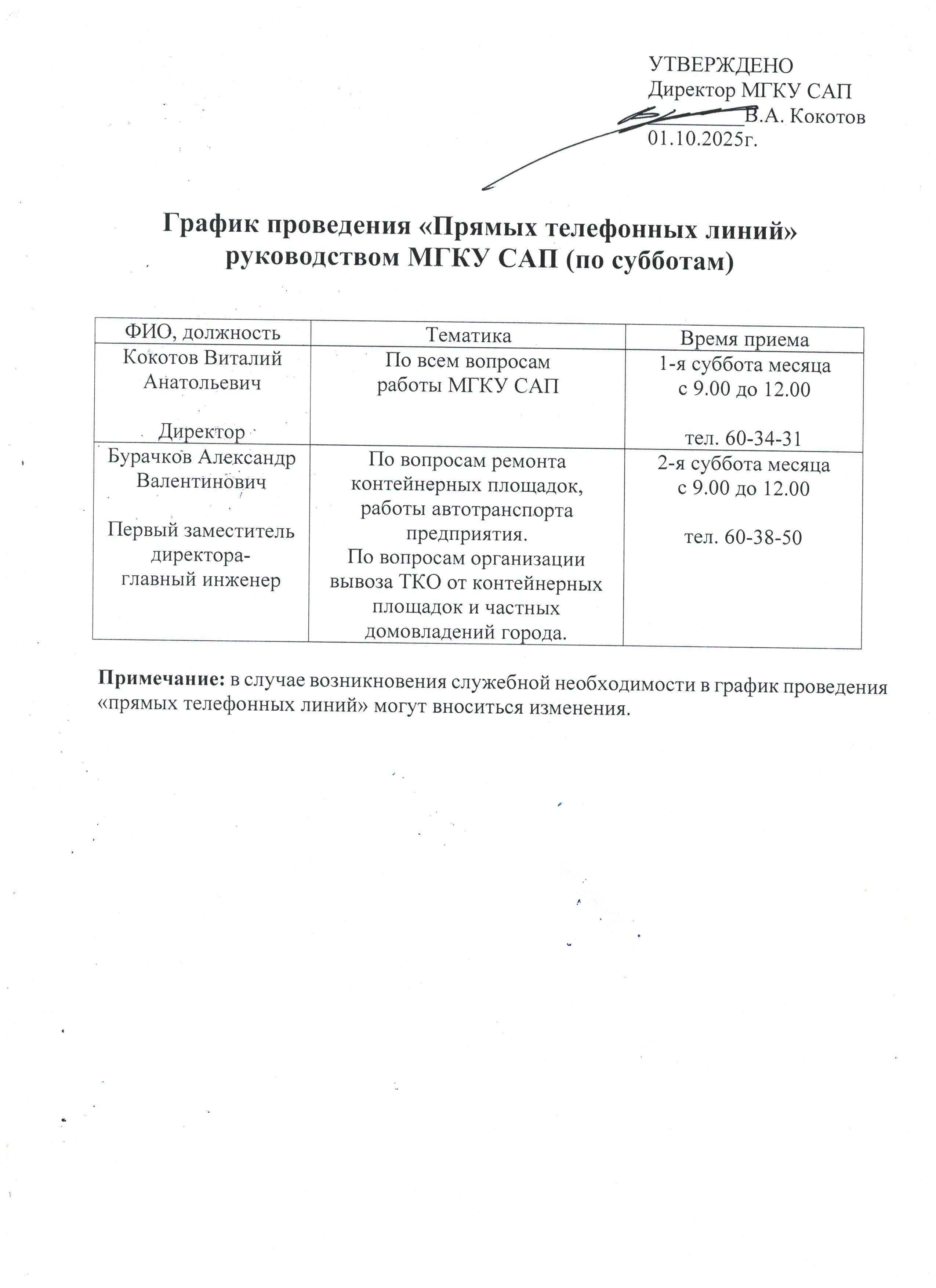 График проведения "Прямой телефонной линии" руководством МГКУ САП
