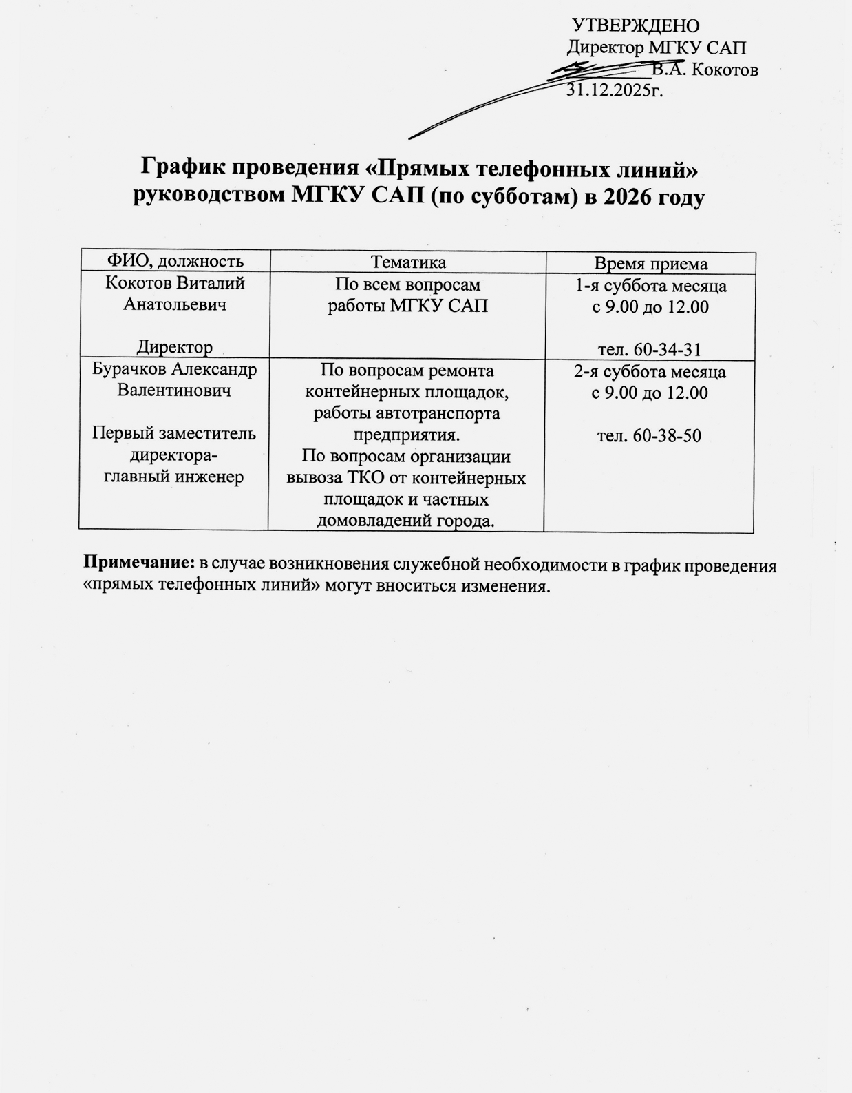 График проведения "Прямой телефонной линии" руководством МГКУ САП